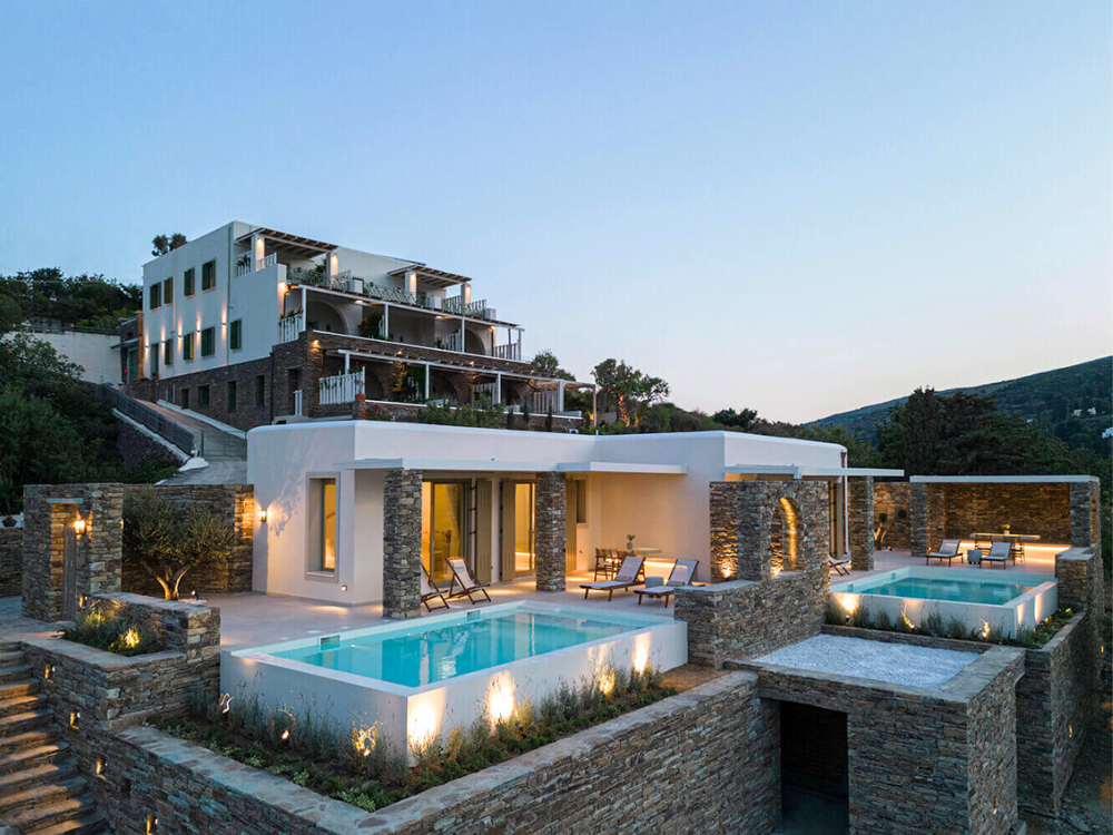 Casa Di Fiori Suites Andros is a luxurious boutique hotel offering a peaceful and private retreat on the beautiful island of Andros. Surrounded by lush greenery, it combines modern Cycladic design with natural elements to create a serene atmosphere. Each suite is designed with modern Cycladic aesthetics featuring spacious interiors, large windows and natural materials that create a serene atmosphere. The hotel provides top-notch amenities, including air conditioning, WiFi and room service, ensuring a comfortable and relaxing stay. Ideal for those seeking a tranquil escape, the hotel is just a short drive from the lively town of Chora.
