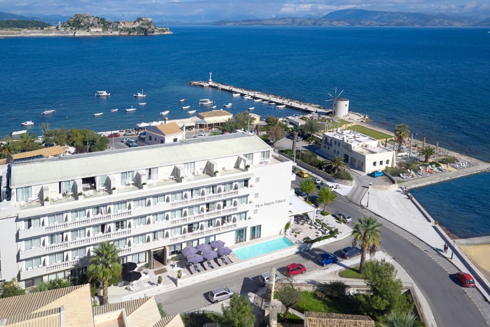 Mon Repos Palace is situated on the famous Corfu promenade at the tip of Garitsa Bay, with panoramic views to the old Venetian fort of Corfu town and directly in front of a small beach.