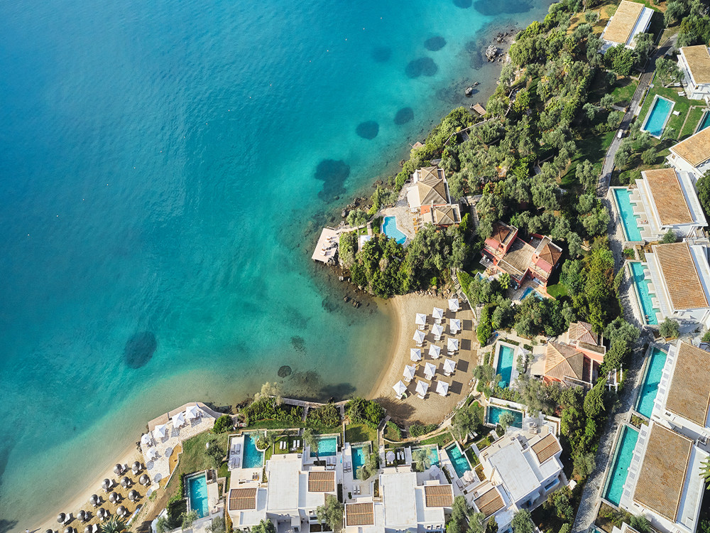 Corfu Imperial A Grecotel Resort is probably Greece’s most impressively located hotel, perched above the olive groves at the end of panoramic Peninsula Kommeno. A world of seaside olive trees, marble & palms, beach coves, fine dining, and a lovely promenade. It is a room with a view or a palazzo over the water. It doesn’t get any better in Corfu. It’s easy to see why it is a popular choice for a luxury holiday.