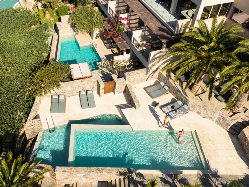 The well kept garden boasts over 30 types of herbs, flowers, and trees, offering a glimpse of Crete's flora. The breakfast buffet's tea corner is stocked with fresh herbs from the Cretan botanical garden, and the hotel's vegetable garden supplies part of its produce. Palm, olive, and carob trees surround three large semi-salt swimming pools, including a magnesium enriched pool with an integrated jacuzzi and a Zen Zone quiet area. There is also a children’s pool, a pool bar with a sun terrace, and a sunbathing lawn.