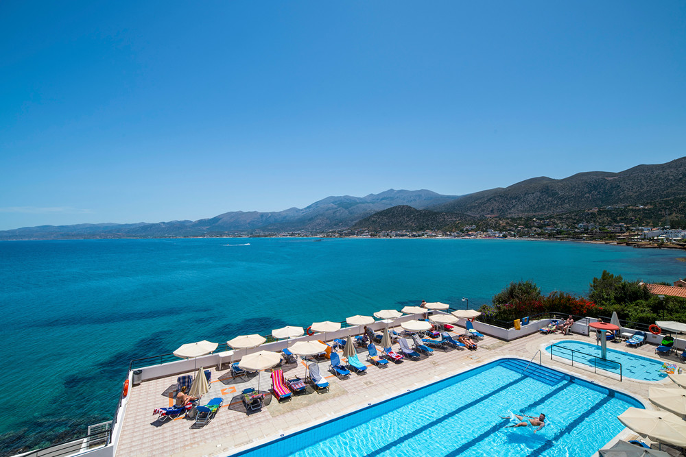 A little oasis of calm greenery and pink bougainvillaea, the picturesque Horizon Beach Hotel in Stalis, Crete, is within easy reach of the resort’s many attractions. Its privileged location overlooks the sweep of the bay and terraces in both the main bar and restaurant offer stunning views – small waterpark, the two swimming pools, snack bar and playground also occupy elevated spots to take advantage of the panorama.