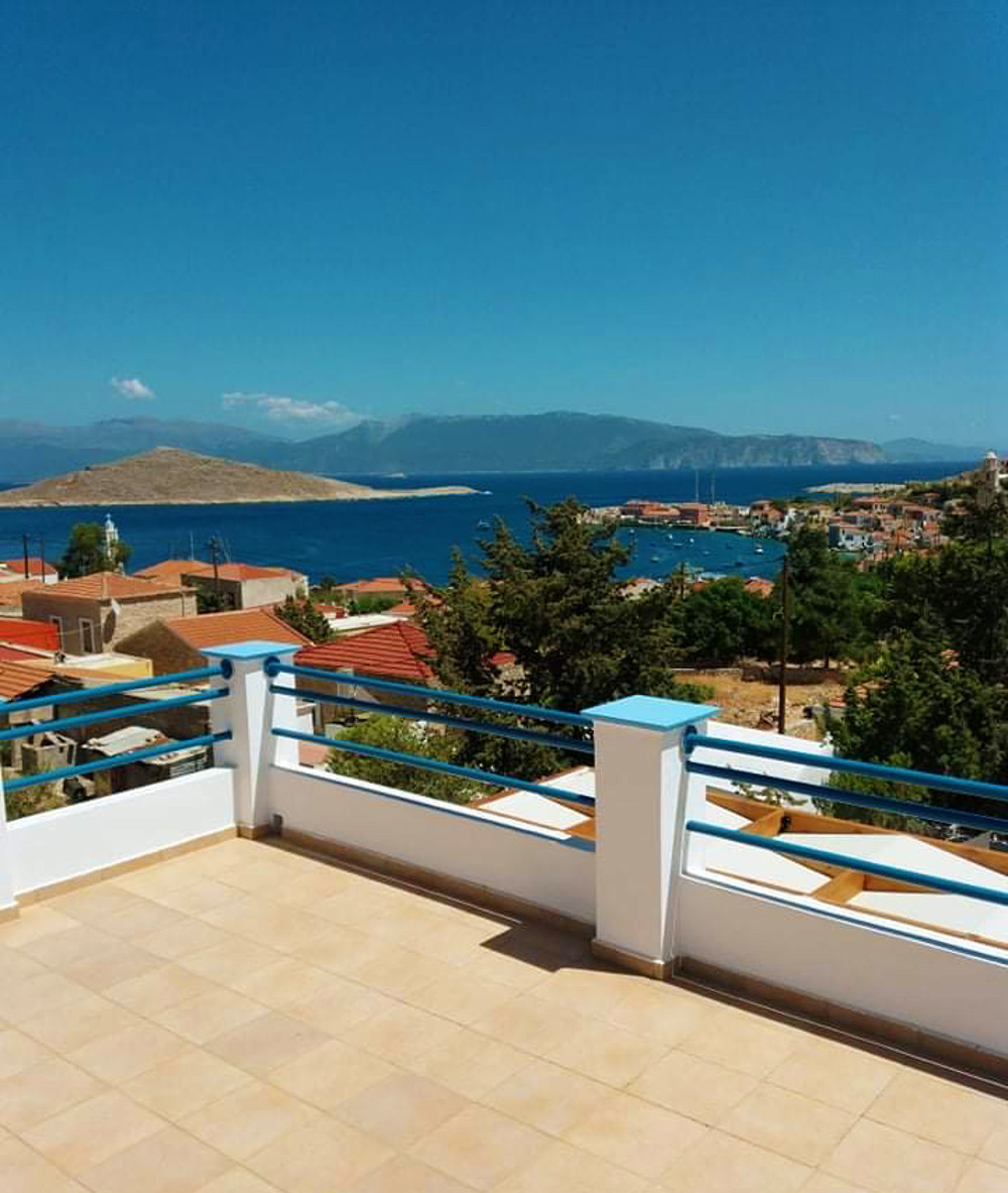Built on three levels with a traditional Halki style, featuring a ground floor studio with inland view, Two bedroom apartment with views across the harbour located on the middle floor and an additional studio on the top floor with panoramic views across the harbour and Nisaki Island from the terrace area.