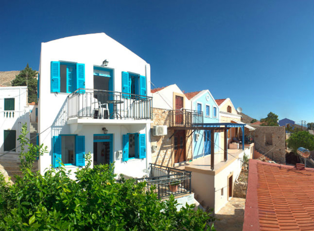 A pretty decorated little house on two floors, off a path fairly high in the village, with great views over the harbour and out to sea from the balcony. Entry is up a few steps onto a small veranda with the door into the kitchen/dining area with table, chairs, refrigerator, mini-oven and kettle. There is also a single sofa bed here. A shower-room/wc is off from the kitchen. A wooden spiral staircase leads up to the twin bedroom, with second shower-room/WC ensuite. The bedroom has a good-size balcony with table and two chairs with panoramic sea views.