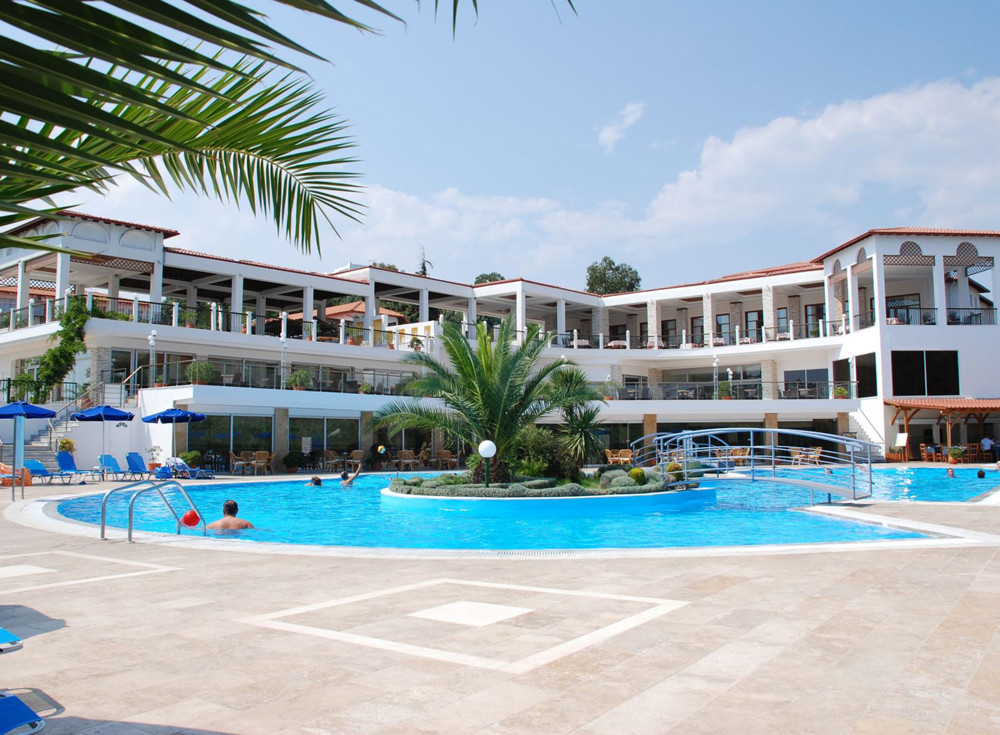 Overlooking the Aegean Sea from a lush hillside, the Alexandros Palace, in Halkidiki, is close to the huge, Blue Flag Tripiti Beach, where the sands lead to child-friendly, shallow waves, also popular for snorkelling.