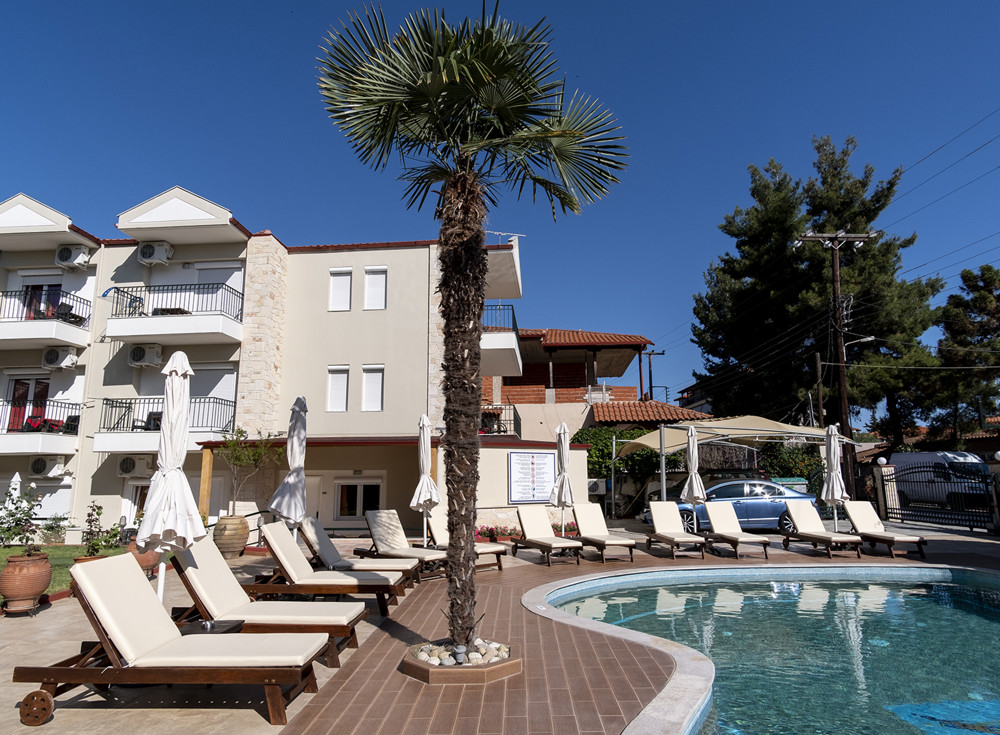 Set amongst the beautiful pine trees, Olympia Hotel is a small, family run hotel and only 2 minutes away from Pefkohori village and just a 5 minute walk from the fantastic beach.