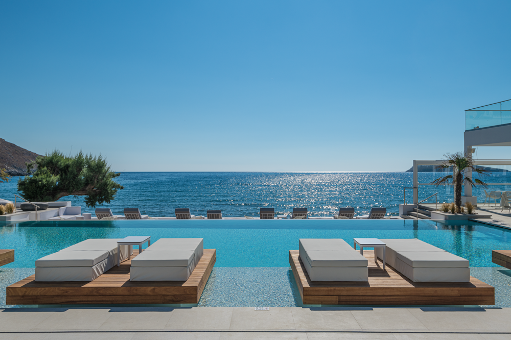 Nestling below the spectacular mountain scenery of Panormos, its architecture reflecting the bright, blue-and-white buildings of the surrounding village, the Kantouni Beach Boutique Hotel is on an unspoilt sandy beach, with the gently-shelving shoreline ideal for children to splash about safely in the sea and the Meltemi breezes encouraging the waves.