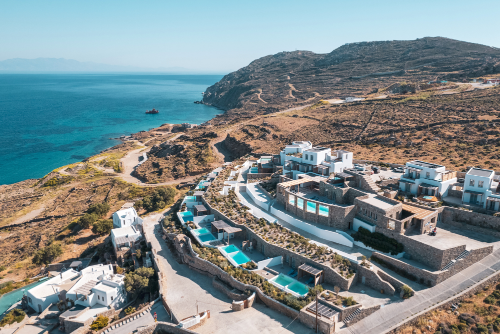 The resort's lavish rooms blend modern sophistication with Mykonian charm. Savour international and Mediterranean cuisines at the on-site restaurant, while poolside bars craft delightful cocktails.