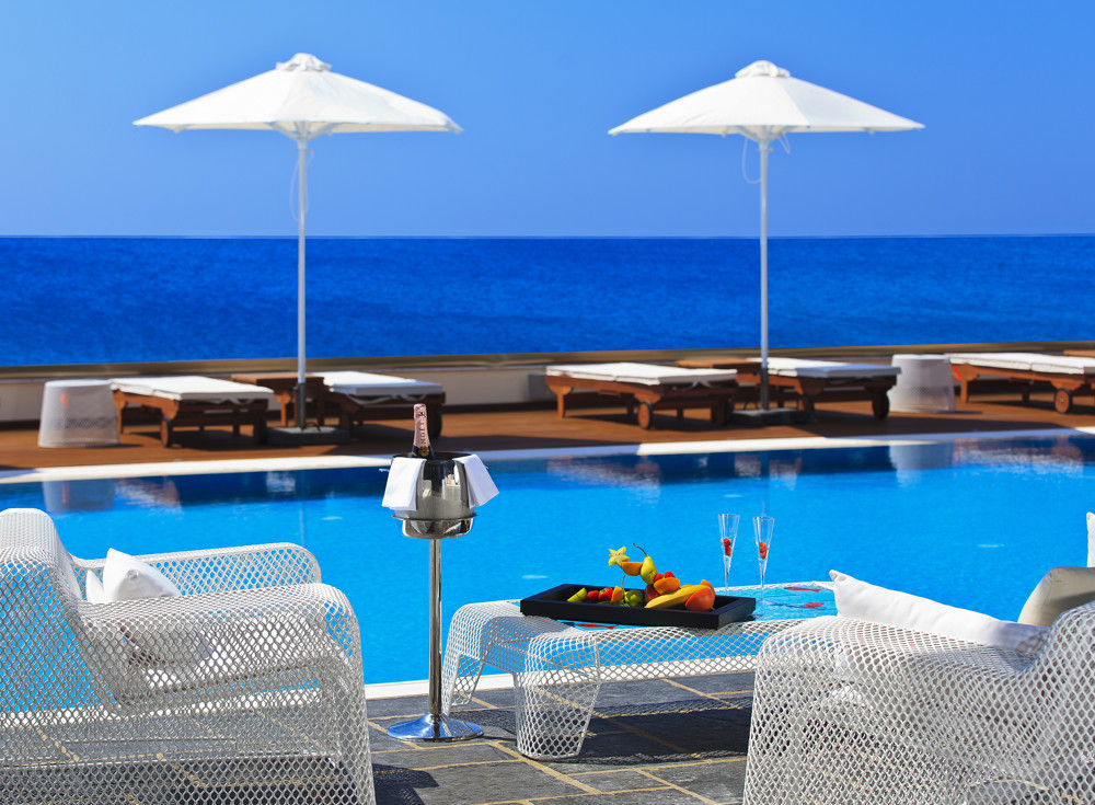 Junior Suite Private Pool Side Sea View (30 m2) sleeps up to 2 adults featuring a spacious terrace and sunbeds, marble-clad bathroom with a bathtub and walk-in shower, seating area and user-friendly technology. The room features the same facilities as per the Superior Deluxe Room Sea View.