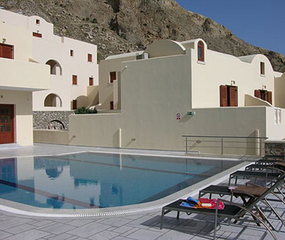 Hotel Epavlis fitted with all modern facilities and located in a quiet spot on the mountainside overlooking the resort of Kamari. This beautiful well designed hotel is just 200 metres from the black sandy beach of Kamari and the inviting clean blue sea. Shops, restaurants and bars are also located in this beach resort area, Fira the capital of Santorini is 9 kms from the complex and 5 kms from the airport.