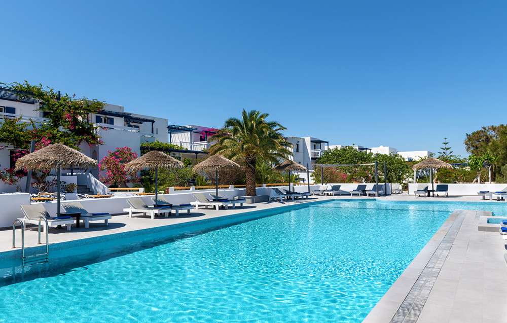 The endless blue of the sky and the sea, white of the traditional houses and the black of the volcano create a harmonious, magical landscape. In this idyllic setting you will find Kamari, a beautiful seaside village where was built one of the most modern hotel establishments. The hotel is built with loving care and experience and is an ideal combination of traditional architecture on the outside and modern rooms on the inside.