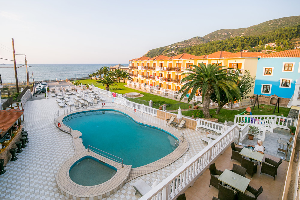 The Aeolos Hotel features 61 comfortable rooms and two suites, most with sea views, and is particularly child-friendly, with a pool for youngsters and a small, safe playground.