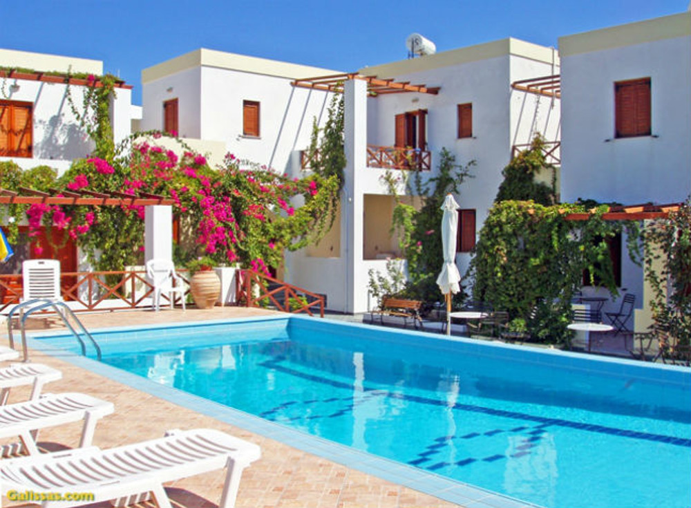 Studios (sleeping up to 3 people) with inland view or pool view, one bedroom apartments (sleeping up to 3 people) with garden or pool view. All rooms have shower, kitchenette (with two cooking rings), TV, telephone, air conditioning and private balcony or terrace. Please note: A torch is recommended for returning home at night.
