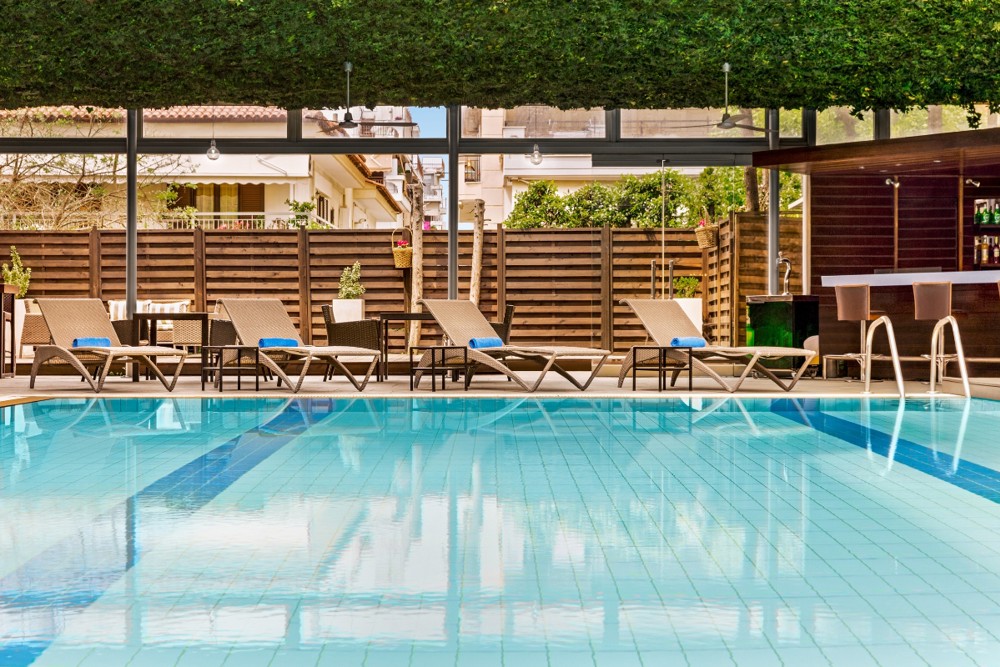 The hotel features spacious modern and tastefully decorated rooms with all the necessary amenities for a pleasant stay. For those who wish to unwind and enjoy Greek sunshine, the outdoor swimming pool is just the place to be. Pick a sun lounger on the wooden deck and sip on iced cold cocktails from the pool bar and dive in the fresh water.